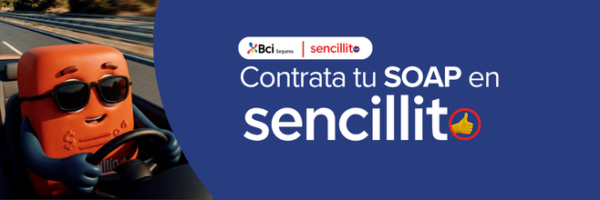 Ya tenemos venta activa del SOAP BCI 2026 con la nueva Ley Jacinta, y como sabemos que cada año se vuelve una carrera contra el tiempo, esta vez queremos que respires tranquilo. En Sencillito lo haces en minutos, desde donde estés y con precios que parten en $7.180. Porque sí, pagar el SOAP obligatorio no tiene por qué ser un trámite complicado ni una vuelta larga.